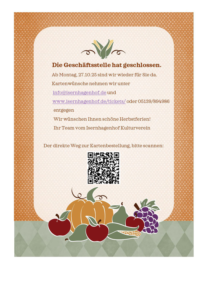 Die Straßenbaumaßnahmen auf der K113, Isernhagen KB und FB, sind in vollem Gang. Dieses erfordert eine Sperrung der Straße ab Isernhagen KB, ab Heinrich-Könecke-Straße - Dorfstraße in Richtung Isernhagen FB. Aus diesem Grund ist eine Anfahrt mit dem Auto nur über Burgwedel und Neuwarmbüchen möglich! Nach dem REWE-Markt in Isernhagen FB, kommt das Schild "Sackgasse, frei bis zur Baustelle" dies können Sie umfahren um weiter auf der Hauptstraße in Richtung Isernhagenhof zu fahren. Die Anfahrt mit dem Bus der Linie 620 vom Fasanenkrug (Hannover - Isernhagen Süd) ist nur noch einmal pro Stunde möglich, die Fahrt erfolgt über Isernhagen HB und die Tiefe Trift, von Großburgwedel aus gibt es ebenfalls die Chance, den Isernhagenhof zu erreichen.